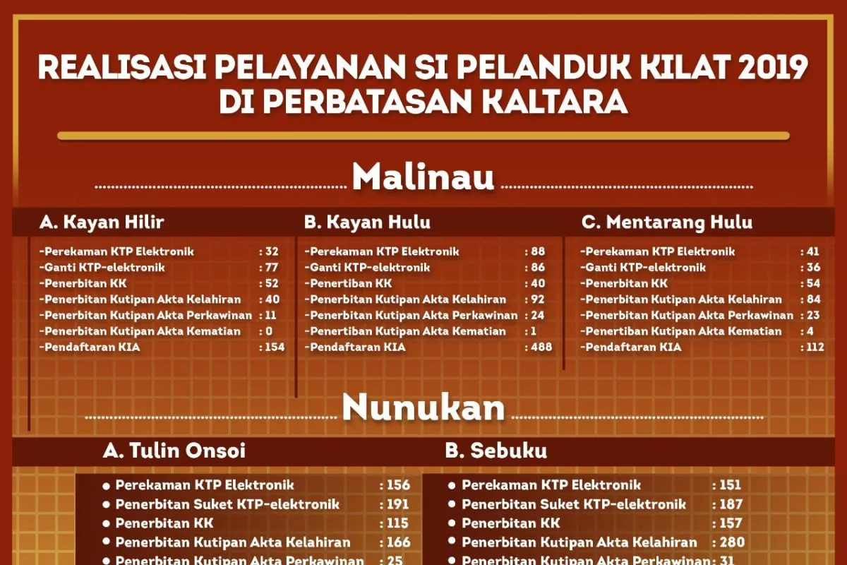 Seperti definisinya, Sipelandukilat juga memberikan pelayanan di kabupaten perbatasan lainnya di Kaltara, yakni Nunukan. Terbaru, Sipelandukilat merealisasikan pelayanan 6 hari sejak 18 hingga 23 Maret di 2 kecamatan. Yakni, Kecamatan Tulin Onsoi dan Sebuku. “Kami merencanakan pelayanan ini akan dilanjutkan di Nunukan, tepatnya di Kecamatan Krayan,” timpal Kepala Disdukcapil Kaltara, Samuel Parrangan menutup.